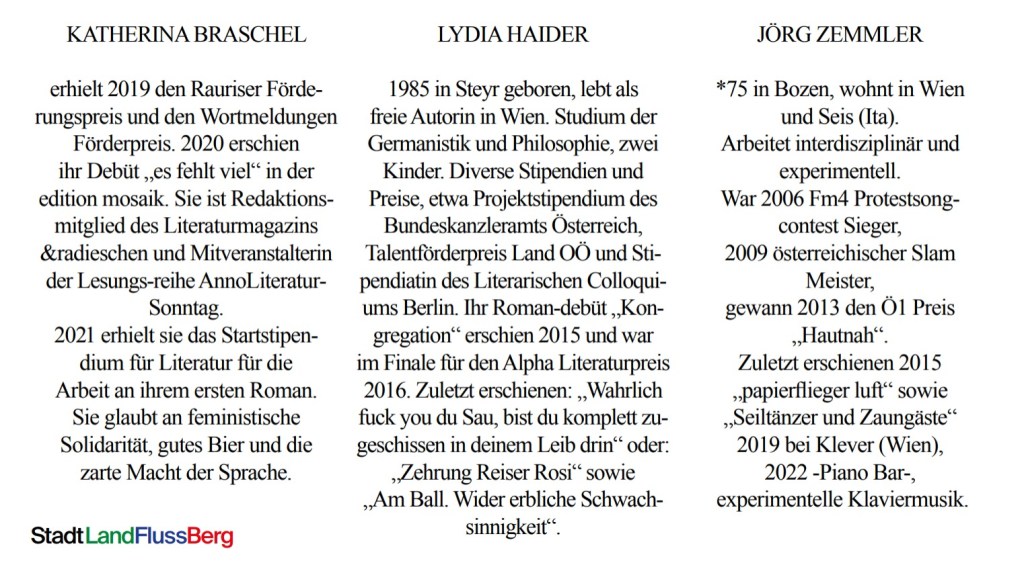 Katharina Braschel, Lydia Haider & Jörg Zemmler 1657992600 Tage Stunden Minuten SekundenbisKulturverein Mühldorf Lässt Lesen Platz Reservieren Teilen mit: Klicke, um auf X zu teilen (Wird in neuem Fenster geöffnet) X Klick, um auf Facebook zu teilen (Wird in neuem Fenster geöffnet) Facebook Gefällt mir Wird geladen … Ähnliche Beiträge