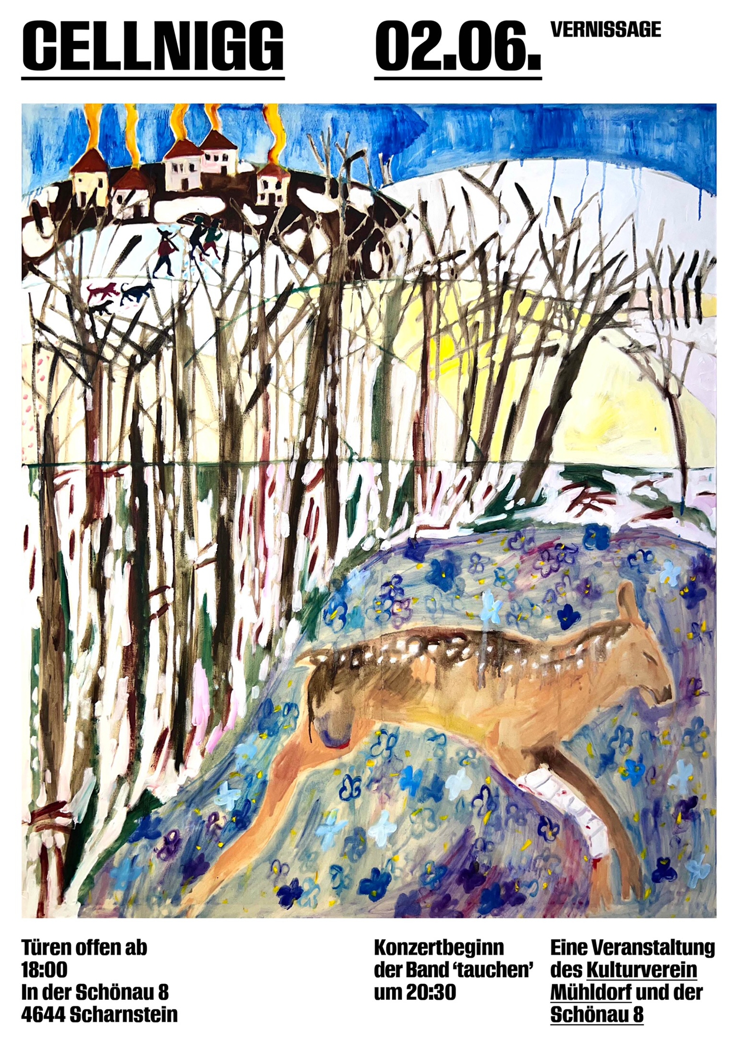 In meist großem Format arbeitet Theresa Ulrike Cellnigg mit kräftigen Farben und schnellem Strich Themen zwischen Liebe und Gewalt, Tod und Leben, Macht und Machtlosigkeit, Unbehagen und Mut ab. Die Ausführungen ihrer Darstellungen bewegen sich im Wechselspiel zwischen Grobheit, Genauigkeit, Abstraktion und Figuration. Kunsthistorische Referenzen treffen auf zeitgenössische Erscheinungen.